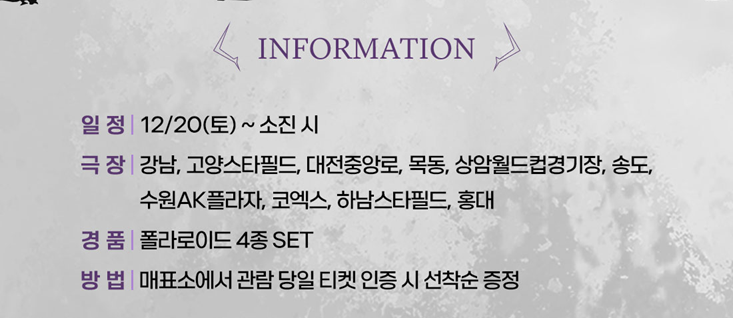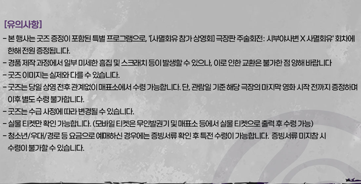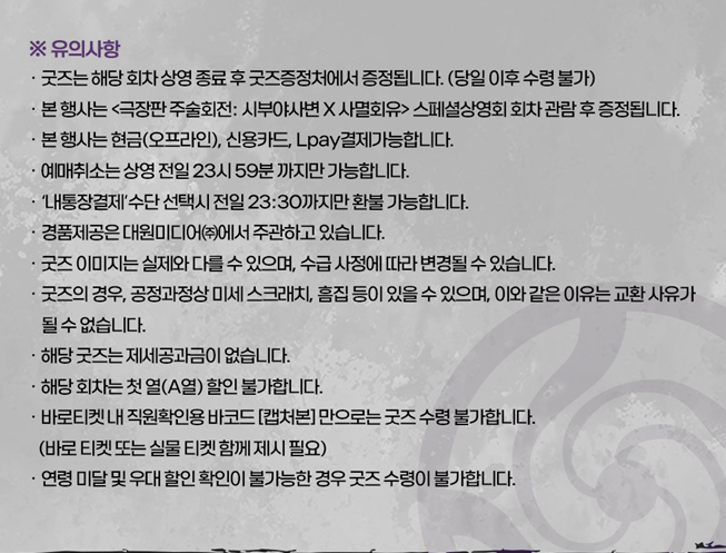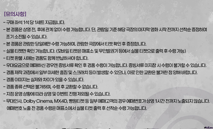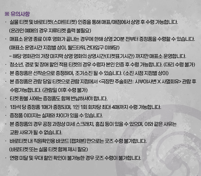 상영관이 다소 적습니다. 상영관 확인하시고, 상영회 회차인지 확인하셔서 수령하실 수 있길 바라겠습니다.