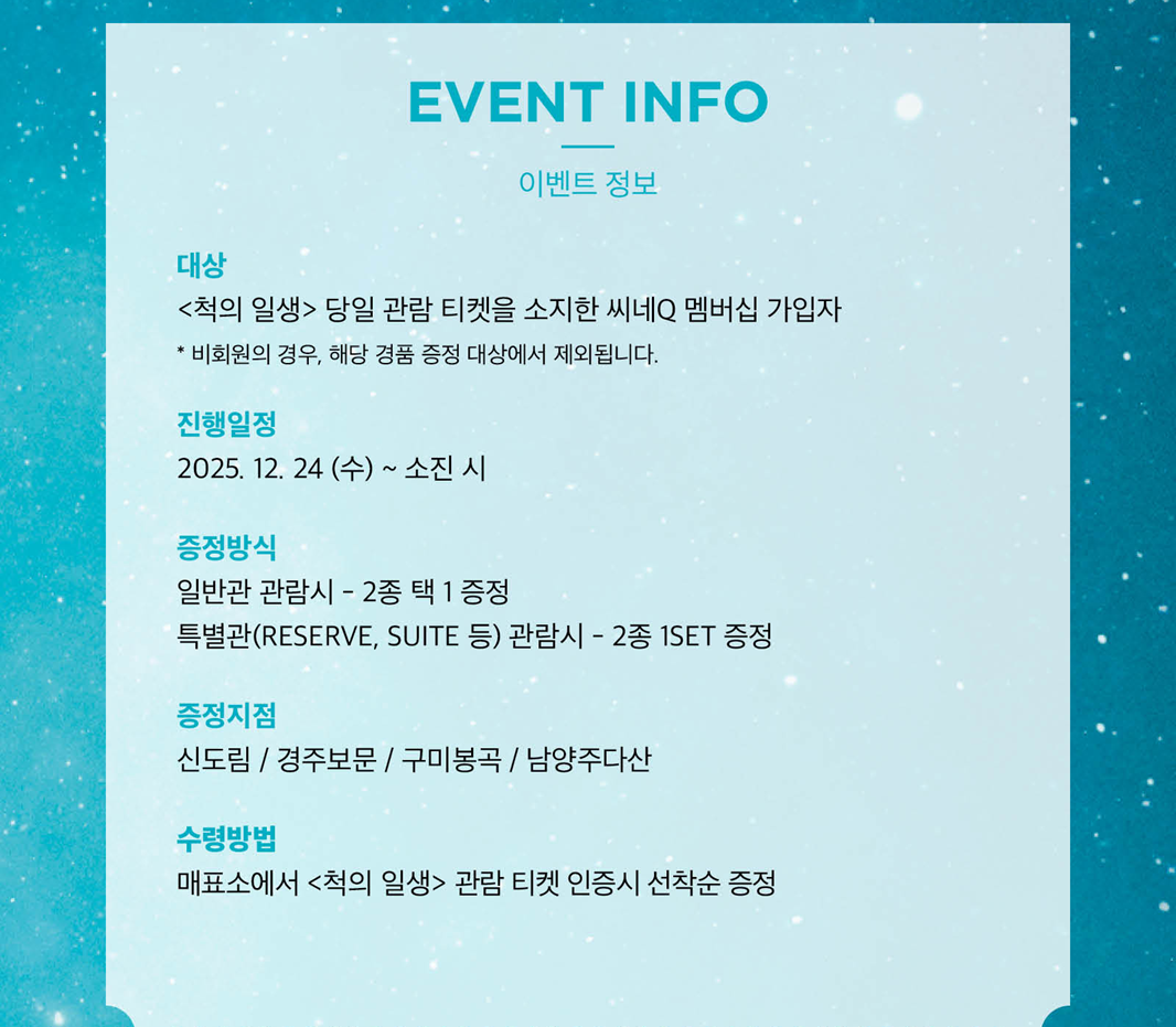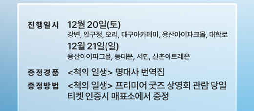 제가 늦게 봐서 토요일은 이미 지나갔습니다. 이점 죄송합니다. 2025년 12월 21일 일요일에 용산아이파크몰, 동대문, 서면, 신촌아트레온에서 진행되는데, 관람 후 관객 전원 증정합니다.
