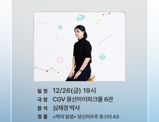 CGV 심채경 박사 GV가 열립니다. '당신의 우주 포스터(A3 사이즈)'가 관객 전원에게 증정됩니다.