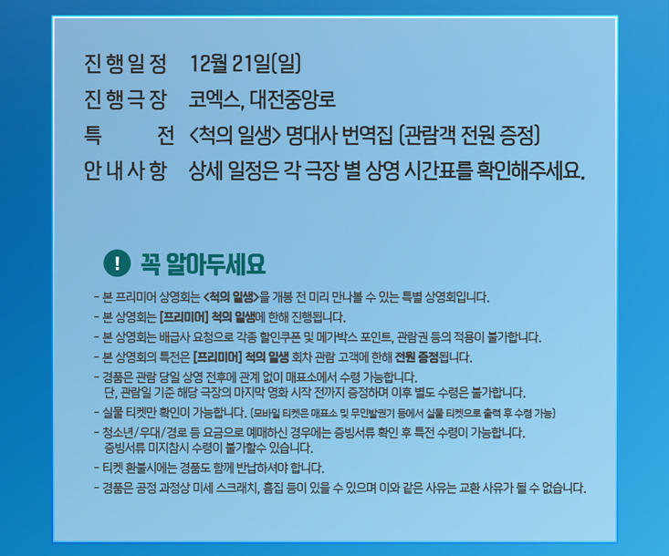 2025년 12월 21일 일요일 코엑스, 대전중앙로에서 진행되는데, 관람 전후에 관계없이 관객 전원 증정합니다.