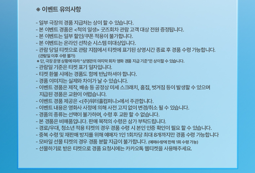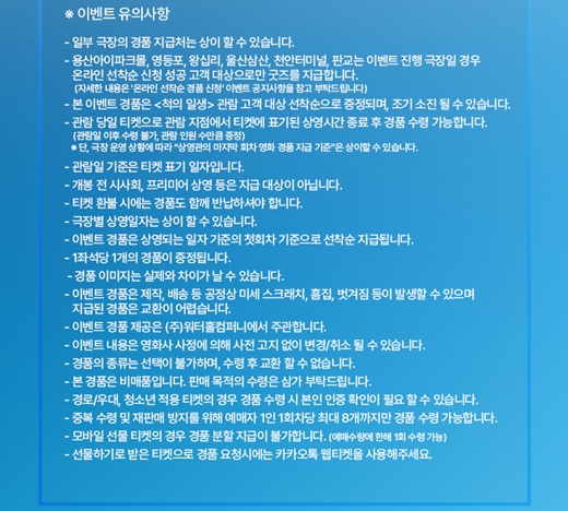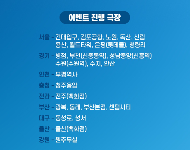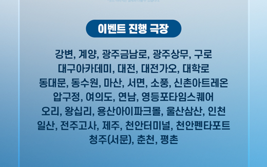 ※ 영화관(극장) 특전 및 이벤트는 이미지를 클릭하시면 잘린 곳 없이 전체적으로 확인이 가능합니다. 더욱 명확하게 내용 파악 및 유의사항 파악을 위해 꼭 클릭하셔서 정보를 확인하시고 특전 수령과 이벤트 참여에 불찰 없으시길 바랍니다.