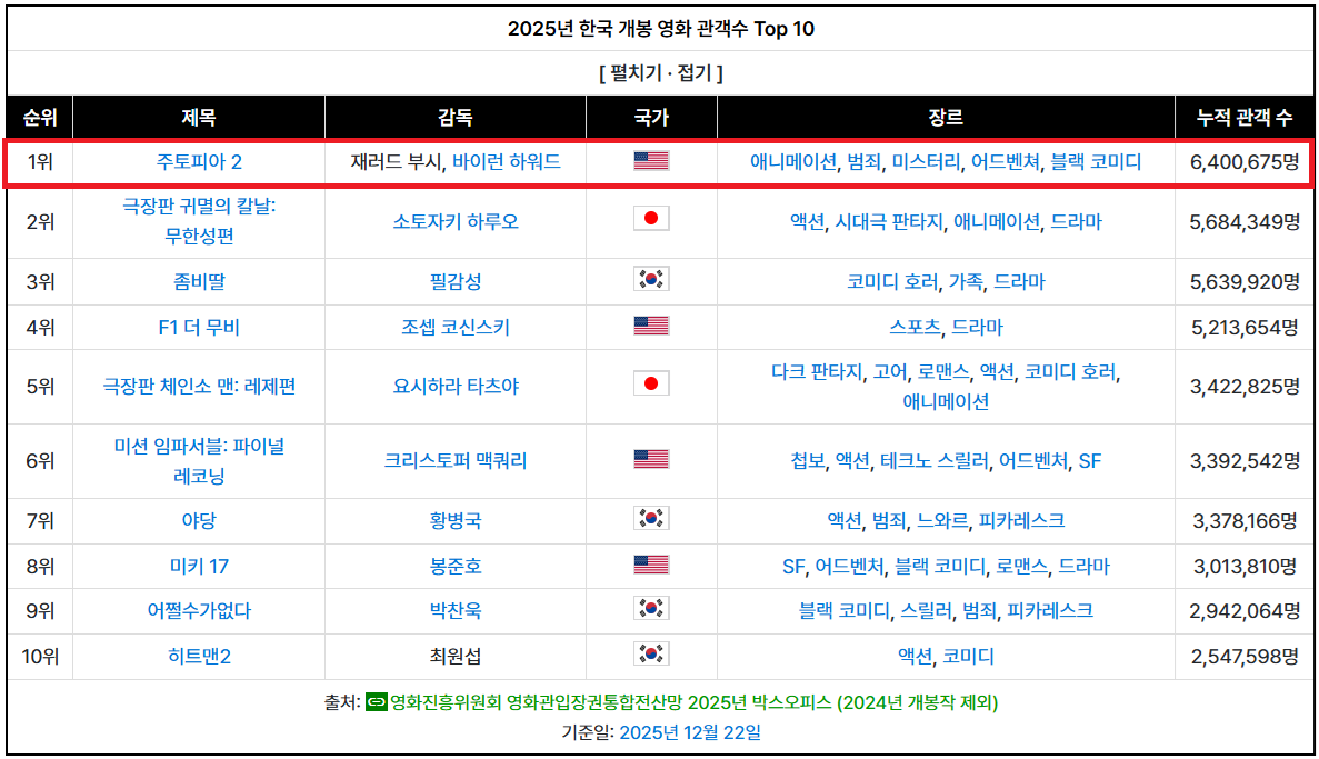 애니메이션 영화 <주토피아 2>가 개봉 23일 만에 2025년 한국 개봉 영화 흥행 순위 1위를 달성했습니다.