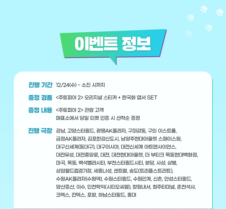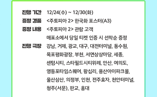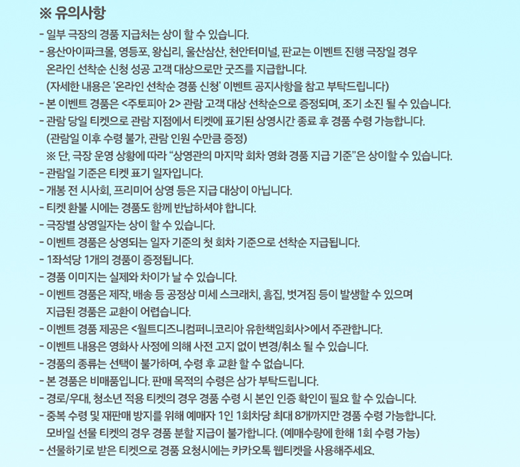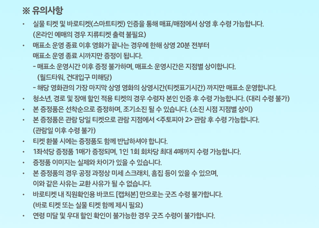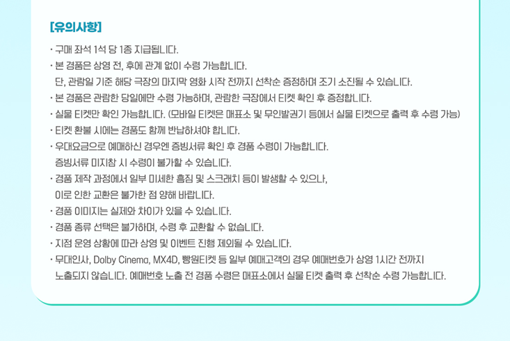 ※ 영화관(극장) 특전 및 이벤트는 이미지를 클릭하시면 전체적으로 자세하게 확인이 가능합니다. 잘린 곳 없이 전체적으로 자세하게 확인이 가능합니다. 더욱 명확하게 내용 파악 및 유의사항 파악을 위해 꼭 클릭하셔서 정보를 확인하시고 특전 수령과 이벤트 참여에 불찰 없으시길 바라겠습니다.