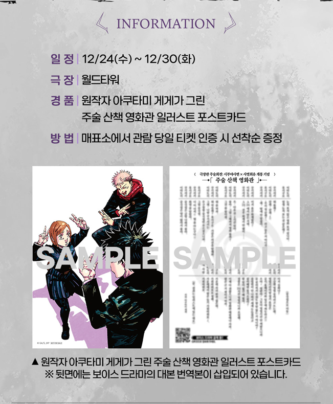 롯데시네마 4주 차 현장 증정 이벤트는 '주술 산책 영화관 일러스트 포스트카드'입니다. 원작자 아쿠타미 게게가 그린 주술 산책 일러스트 포스트카드가 그려졌고, 뒷면에는 보이스 드라마의 대본 번역본이 삽입되어 있습니다.