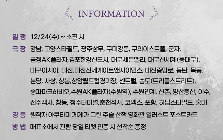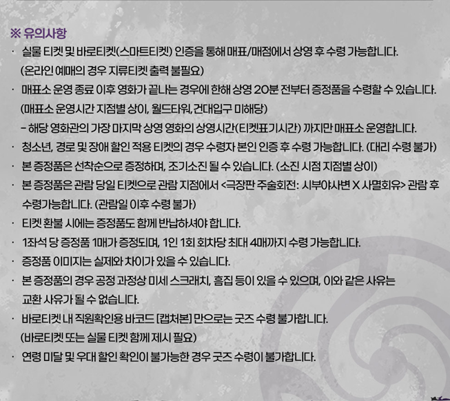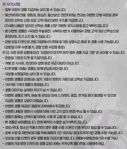 ※ 영화관(극장) 특전 및 이벤트는 이미지를 클릭하시면 잘린 곳 없이 전체적으로 자세하게 확인이 가능합니다. 더욱 명확하게 내용 파악 및 유의사항 파악을 위해 꼭 클릭하셔서 정보를 확인하시고 특전 수령과 이벤트 참여에 불찰 없으시길 바랍니다.