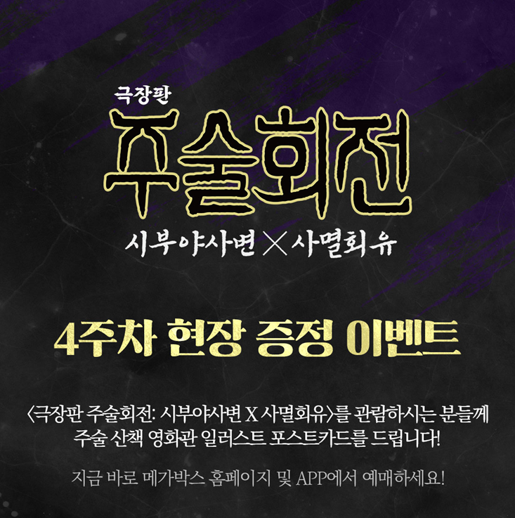 메가박스 4주 차 현장 증정 이벤트는 '주술 산책 영화관 일러스트 포스트카드'입니다. 원작자 아쿠타미 게게가 그린 주술 산책 영화관 일러스트 포스트카드가 그려졌고, 뒷면에는 보이스 드라마의 대본 번역본이 삽입되어 있습니다.