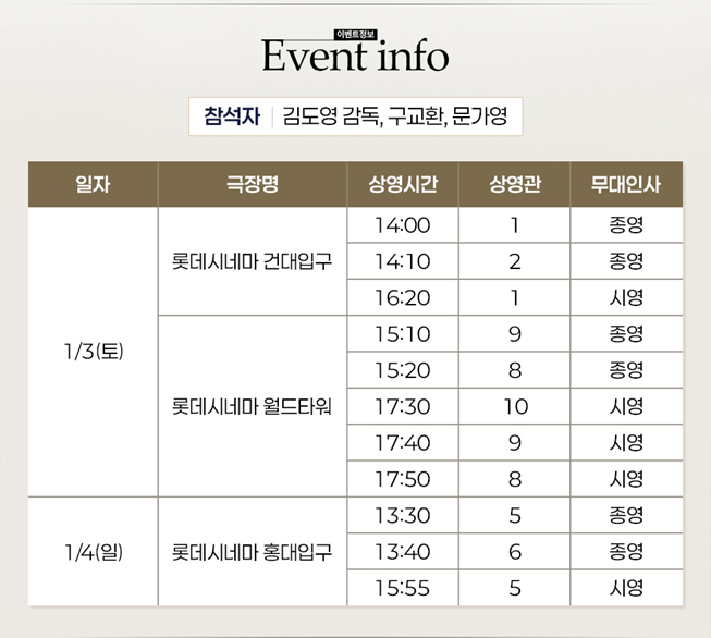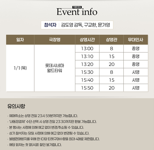 롯데시네마 해피 뉴 이어 무대인사로 김도영 감독과 배우 구교환, 문가영이 참여합니다.