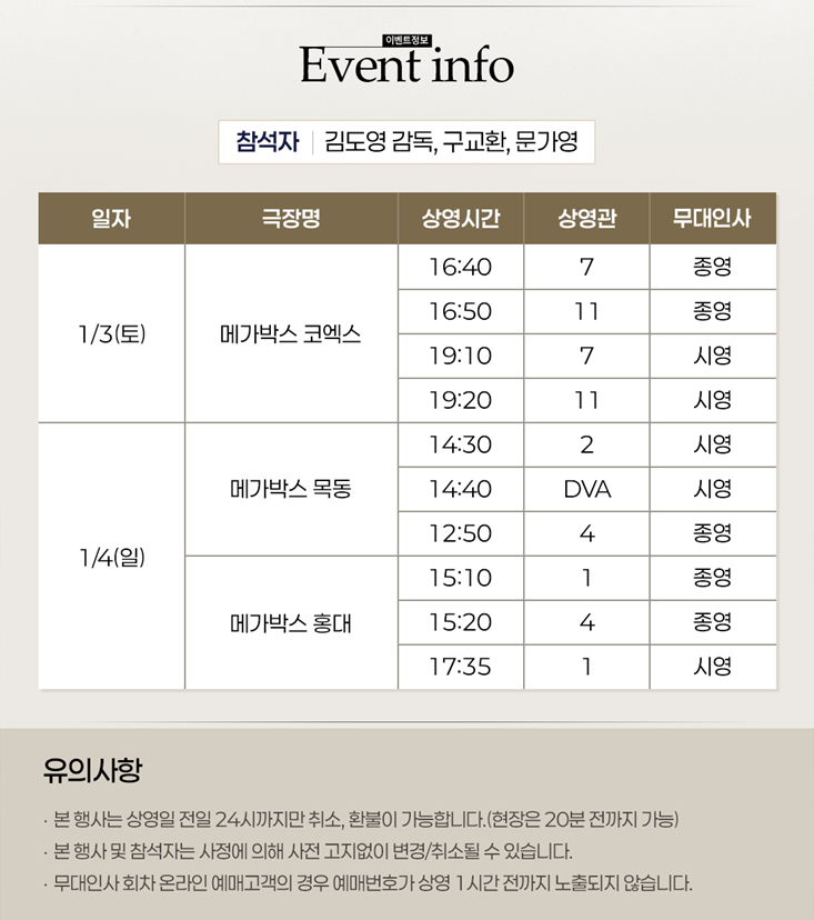 2026년 1월 3일 토요일엔 메가박스 코엑스, 2026년 1월 4일 일요일엔 메가박스 목동과 메가박스 홍대에서 진행됩니다. 자세한 시간은 이미지를 클릭하셔서 확인하시길 바랍니다.