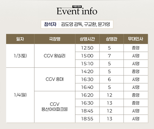 CGV 해피 뉴 이어 무대인사로 김도영 감독과 배우 구교환, 문가영이 참여합니다.