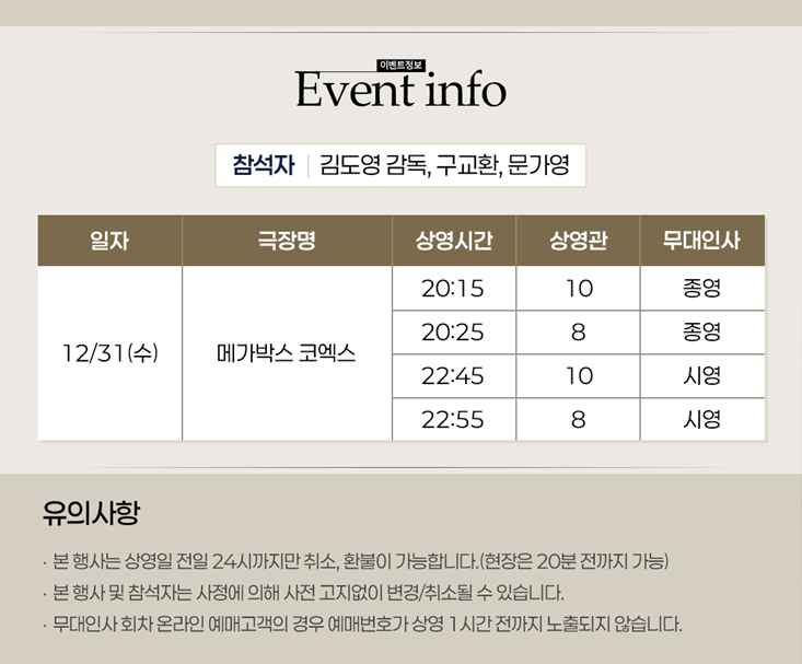 2025년 12월 31일 수요일. 메가박스 코엑스에서 진행됩니다. 자세한 시간은 이미지를 클릭하셔서 확인하시길 바랍니다.