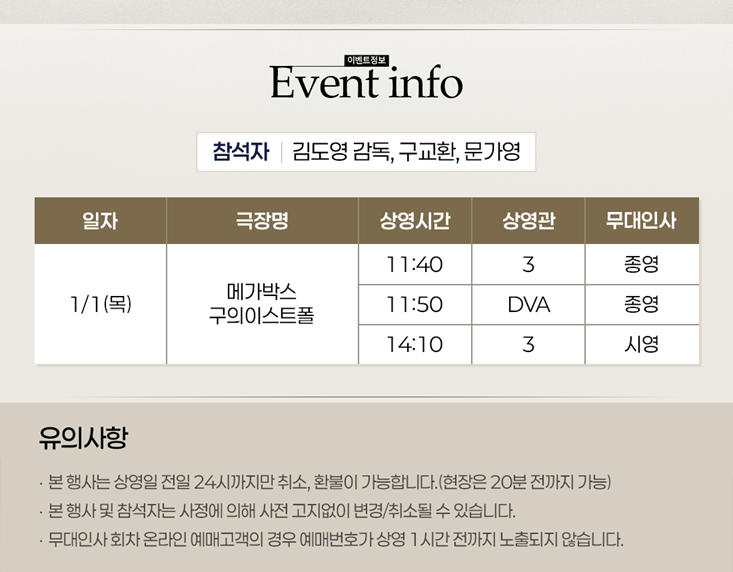 메가박스 해피 뉴 이어 무대인사로 김도영 감독과 배우 구교환, 문가영이 참여합니다.