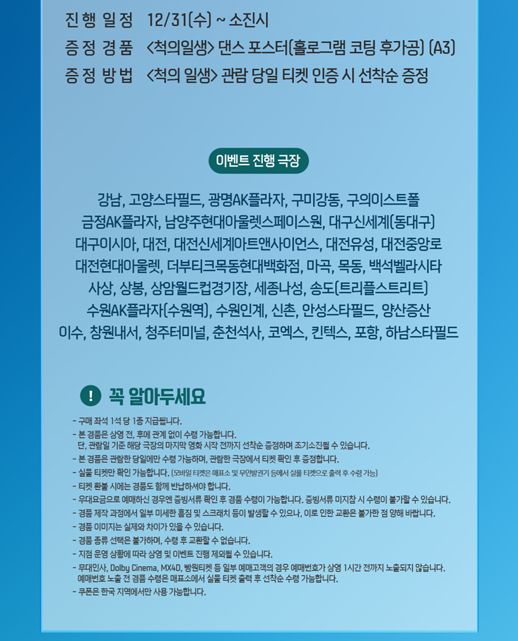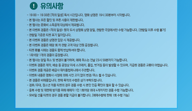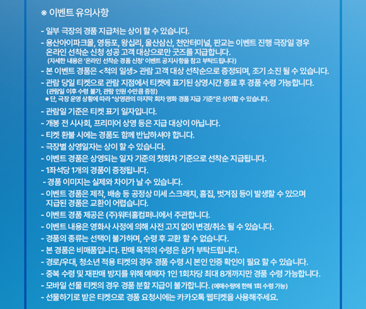 CGV 상영관 중 용산아이파크몰 지점은 '온라인 선착순 경품 신청 성공 고객 대상'에게만 특전을 지급합니다. 미리 신청하셔서 특전을 수령하실 수 있길 바라겠습니다. 그리고 그 외의 특전 진행 상영관 지점은 '별다른 신청 없이' 관람 후에 특전을 수령하시면 됩니다.