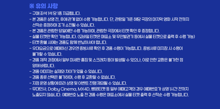 ※ 영화관(극장) 특전 및 이벤트는 이미지를 클릭하시면 잘린 곳 없이 전체적으로 자세하게 확인이 가능합니다. 명확하게 내용 파악 및 유의사항 파악을 위해 꼭 클릭하셔서 정보를 확인하시고 특전 수령과 이벤트 참여에 불찰 없으시길 바랍니다.
