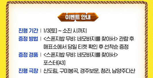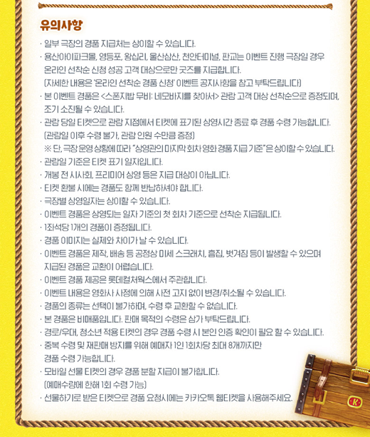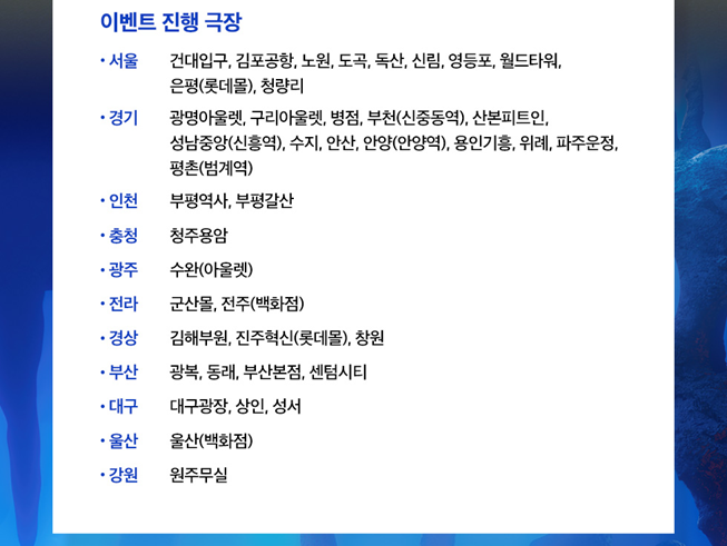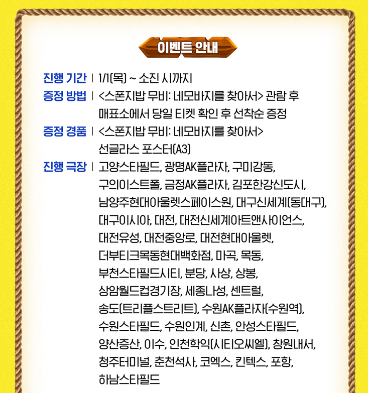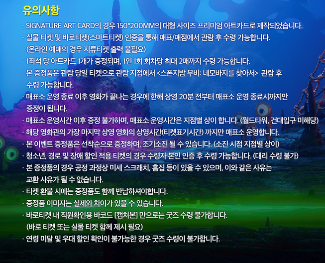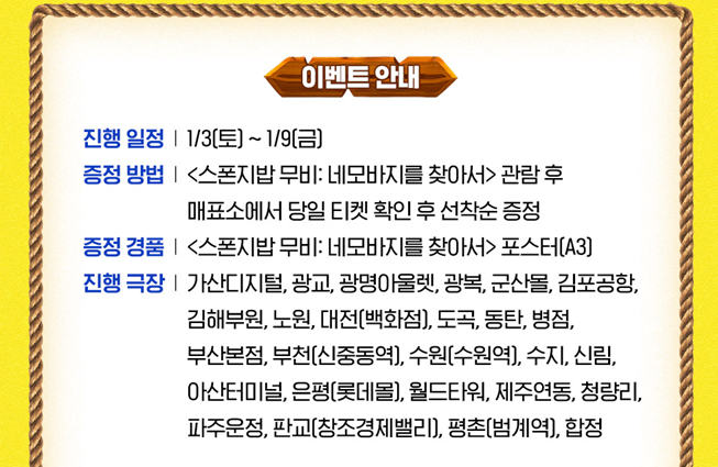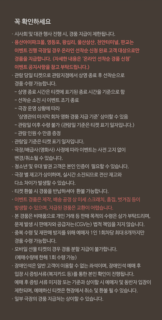 ※ 영화관(극장) 특전 및 이벤트는 이미지를 클릭하시면 잘린 곳 없이 전체적으로 자세하게 확인이 가능합니다. 명확하게 내용 파악 및 유의사항 파악을 위해 꼭 클릭하셔서 정보를 확인하시고 특전 수령과 이벤트 참여에 불찰 없으시길 바랍니다.