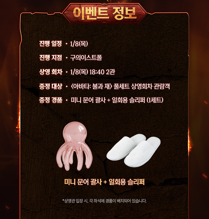 메가박스 앵콜 풀세트 상영회 특전은 '문어 괄사 & 일회용 슬리퍼'입니다.