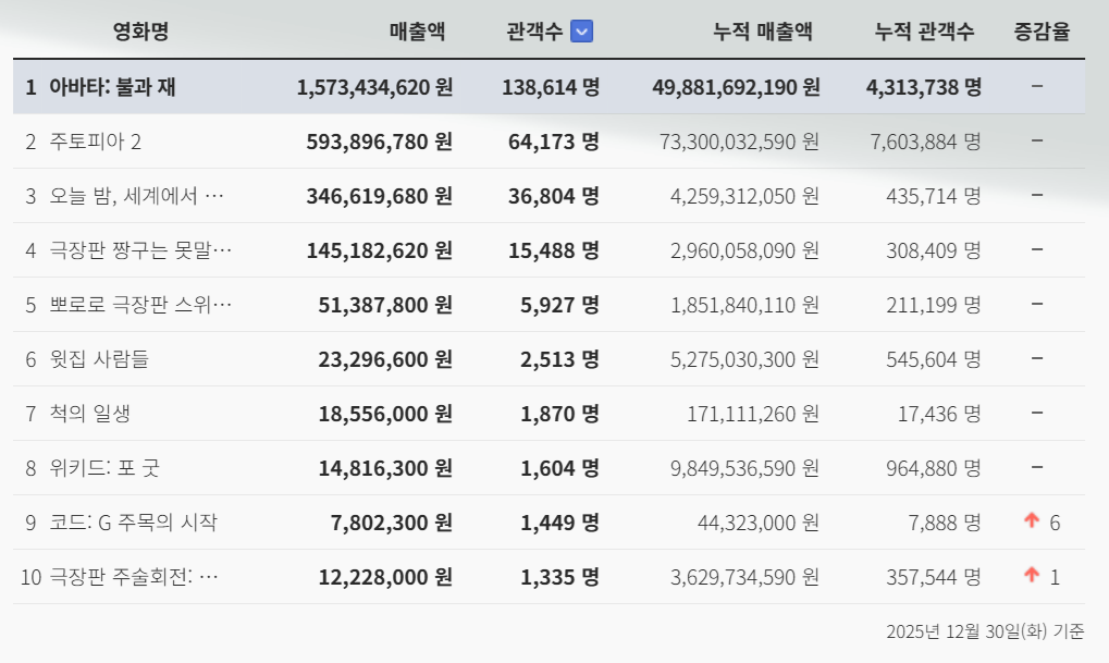 영화 <아바타: 불과 재> 누적 관객수 430만 명