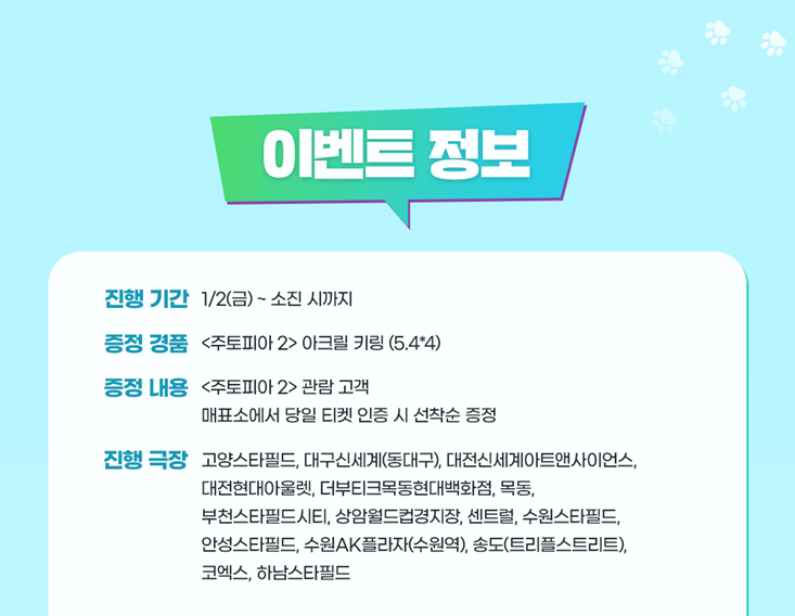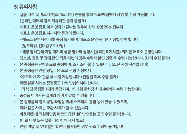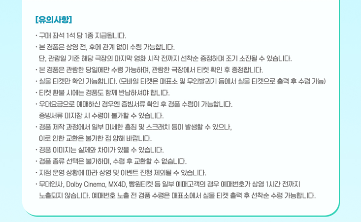 ※ 영화관(극장) 특전 및 이벤트는 이미지를 클릭하시면 잘린 곳 없이 전체적으로 자세하게 확인이 가능합니다. 명확하게 내용 파악 및 유의사항 파악을 위해 꼭 클릭하셔서 정보를 확인하시고 특전 수령과 이벤트 참여에 불찰 없으시길 바랍니다.