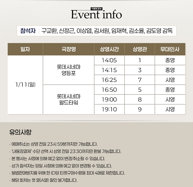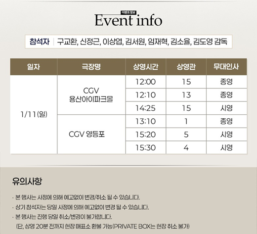 ※ 영화관(극장) 무대인사는 이미지를 클릭하시면 잘린 곳 없이 전체적으로 자세하게 확인이 가능합니다. 명확하게 내용 파악 및 유의사항 파악을 위해 꼭 클릭하셔서 정보를 확인하시고 무대인사 참여에 차질 없으시길 바라겠습니다.