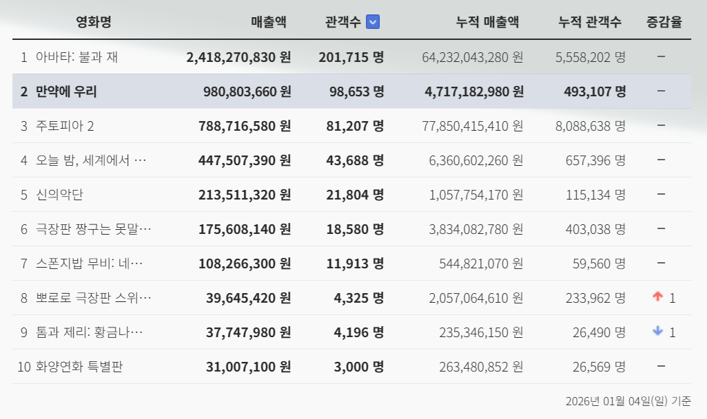 영화 <만약에 우리>가 지난해 마지막 날인 화요일에 개봉하고 벌써 2주 차에 접어들었습니다. 그러면서 지난 일요일 일일 박스오피스는 애니메이션 영화 <주토피아 2>를 넘어섰습니다. 벌써 누적 관객수가 10만 명을 넘었습니다.