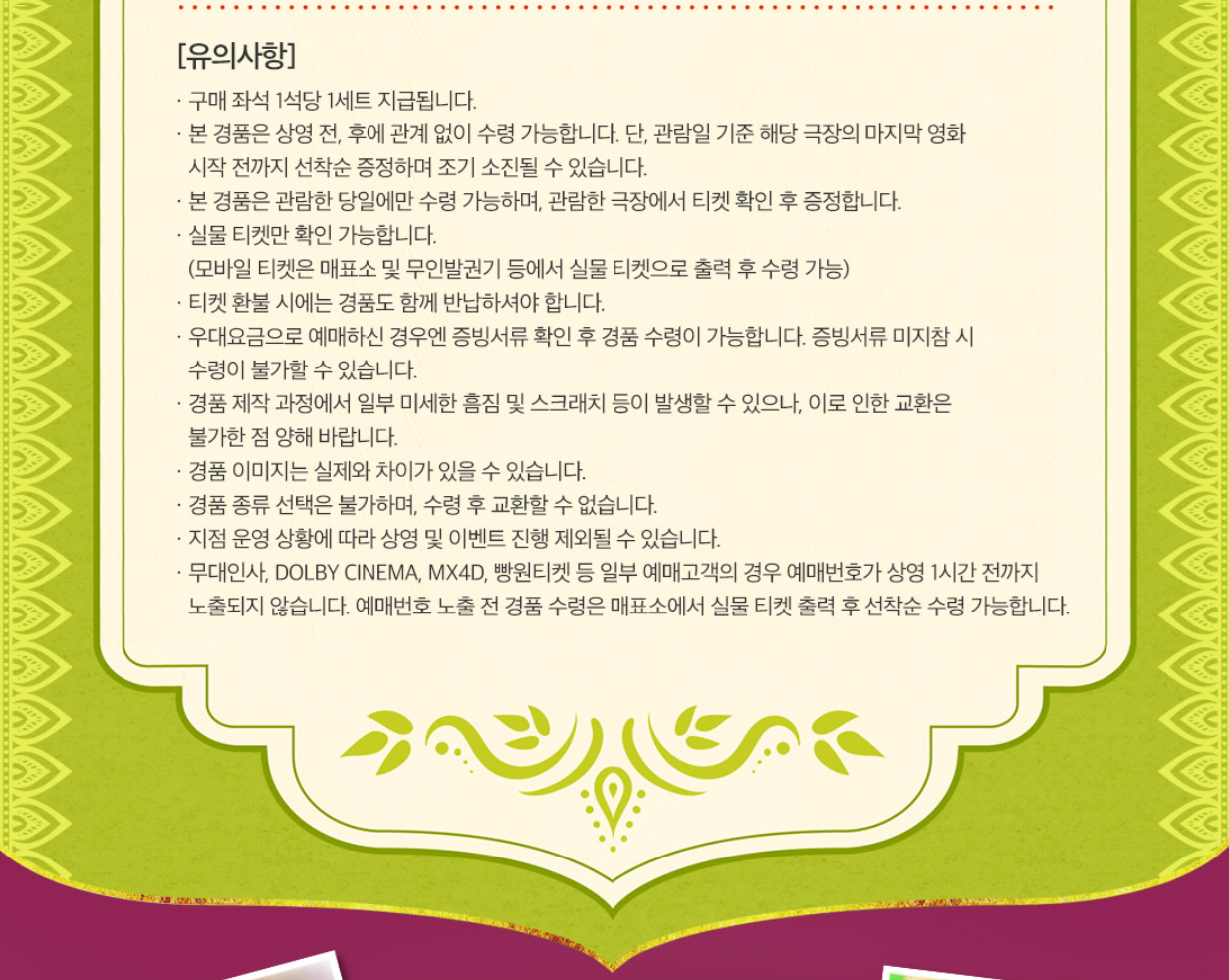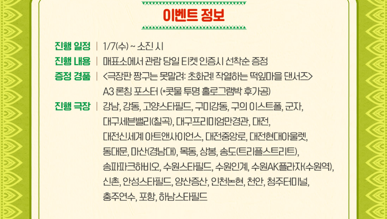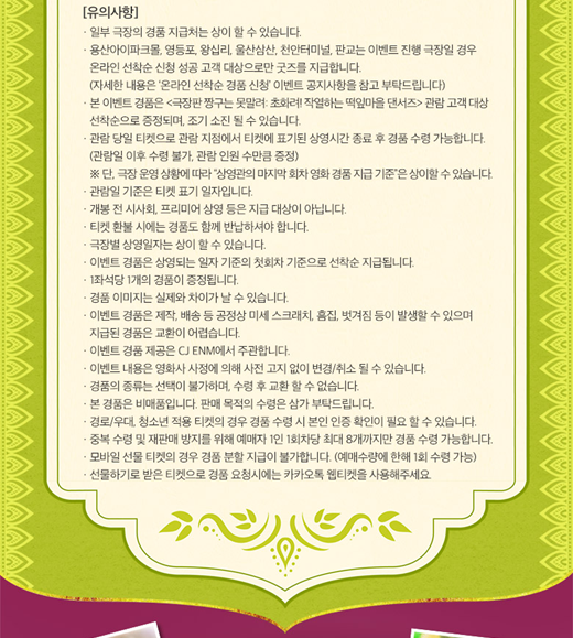 CGV 상영관 중 영등포타임스퀘어, 왕십리, 용산아이파크몰, 울산삼산, 천안터미널 지점은 '온라인 선착순 경품 신청 완료 고객'에게만 특전을 지급합니다. 미리 신청하셔서 특전을 수령하시길 바랍니다. 그 외의 특전 진행 상영관 지점은 '따로 신청할 필요 없이' 관람 후에 특전을 수령하시면 됩니다.