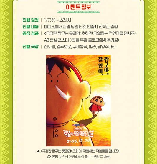 롯데시네마 3주 차 현장 이벤트도 역시 'A3 론칭 포스터'입니다. 맹구 콧물 부분에 투명 홀로그램박 후가공이 되어 있습니다.