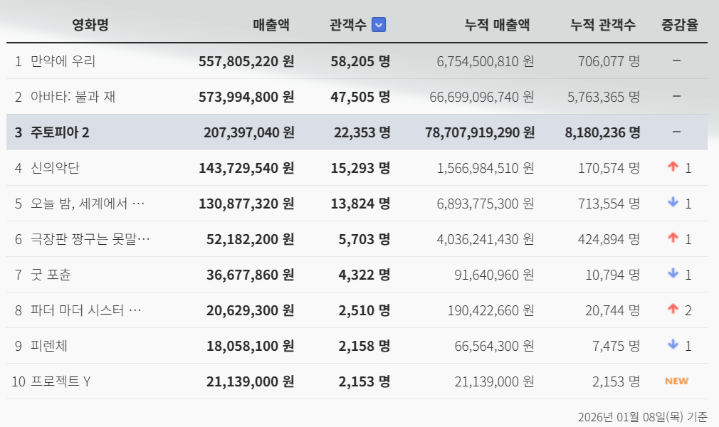 애니메이션 영화 <주토피아 2>의 개봉이 7주 차에 접어들었습니다. 그러면서 누적 관객수가 800만 명을 훌쩍 넘었고, 지속적으로 관람객이 발생하고 있지만 속도가 더디고, 멀티 플렉스 상영관들의 스크린수와 이벤트들이 현저히 줄고 있어 사실상 천만 관객 영화로 등극하기엔 어렵지 않을까 싶습니다. 물론 상영이 계속해서 연장이 되고, 다시 특전들이 많이 풀린다면 괜찮겠지만 말입니다.