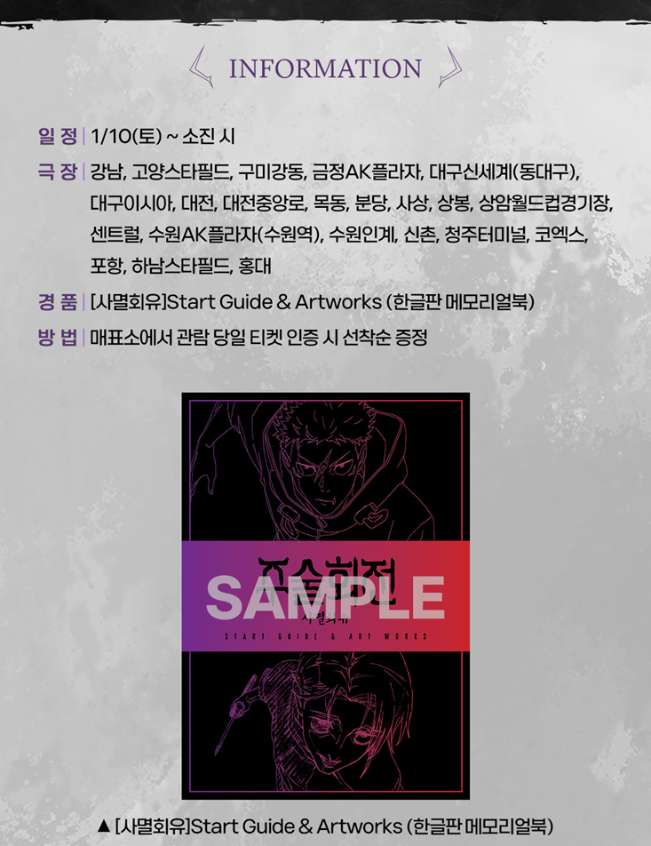 출처 : 대원미디어(주), 메가박스중앙(주), CGV, 롯데시네마, 메가박스, 씨네큐(씨네Q, CINE Q), MAPPA, TOHO NEXT, 주술회전 제작위원회, 애니박스, 넷플릭스(NETFLIX), 티빙(TVING), 웨이브(Wavve), 왓챠(WATCHA)