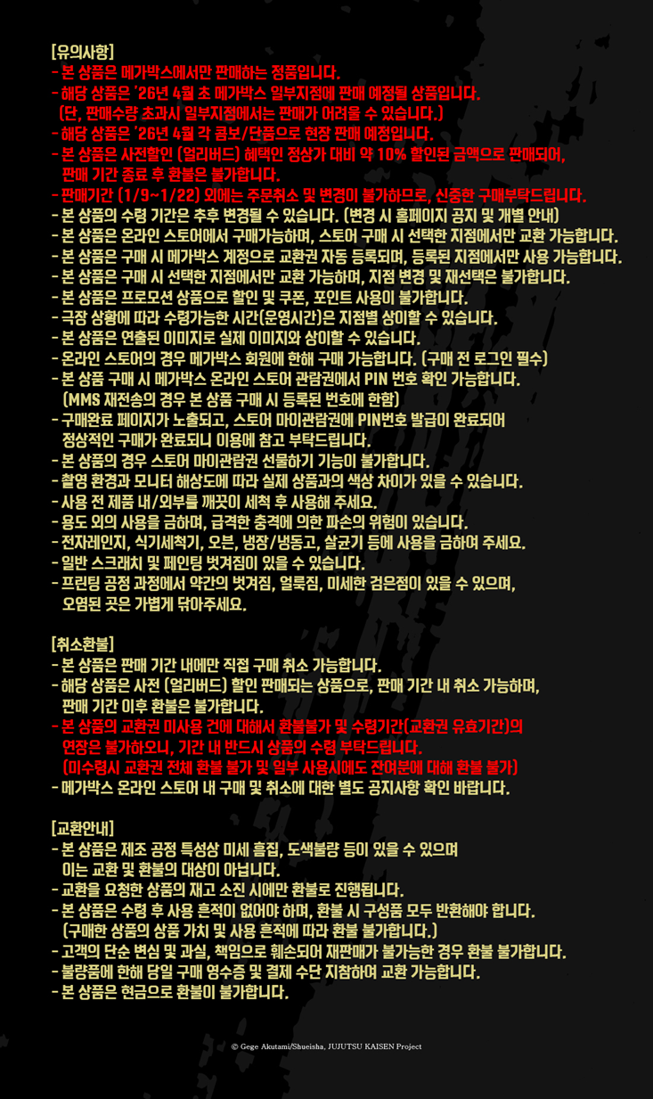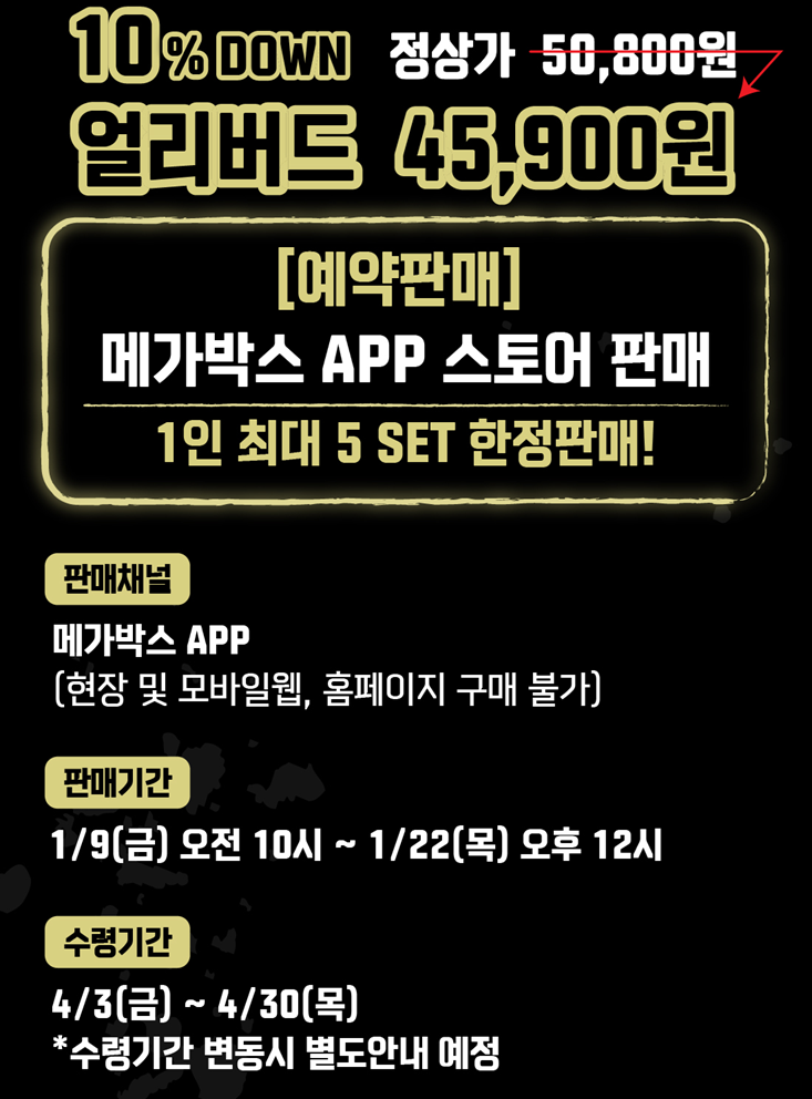 2026년 1월 9일 금요일 오전 10시부터 2026년 1월 22일 목요일 오후 12시까지 판매하며, 메가박스 APP에서만 판매합니다. 현장 및 모바일웹 및 홈페이지 구매 불가합니다.