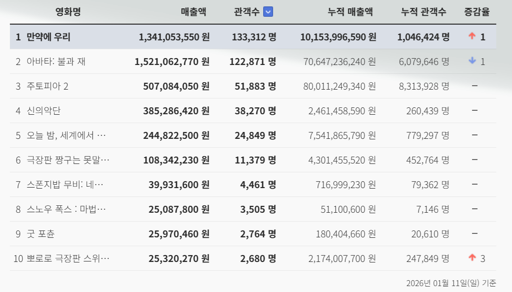 영화 <만약에 우리>가 입소문을 타며, 영화 <아바타: 불과 재>, 애니메이션 영화 <주토피아 2>라는 엄청난 경쟁작들을 이겨내고 일일 박스오피스 1위를 달성했습니다. 지난주 목요일(8일)부터 주말에도 계속해서 1위를 달리면서 반응이 뜨겁습니다.