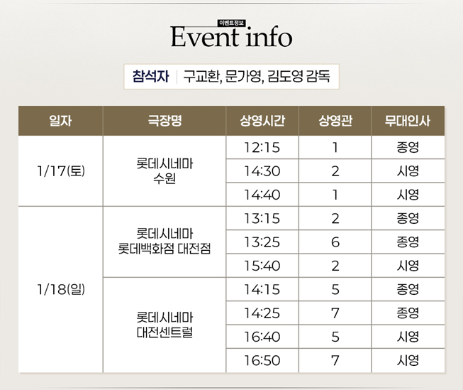 2026년 1월 17일 토요일에 롯데시네마 수원에서, 2026년 1월 18일 일요일에 롯데시네마 롯대백화점 대전점과 롯데시네마 대전세트럴에서 진행됩니다. 자세한 일정은 이미지를 클릭하셔서 확인하시길 바랍니다.
