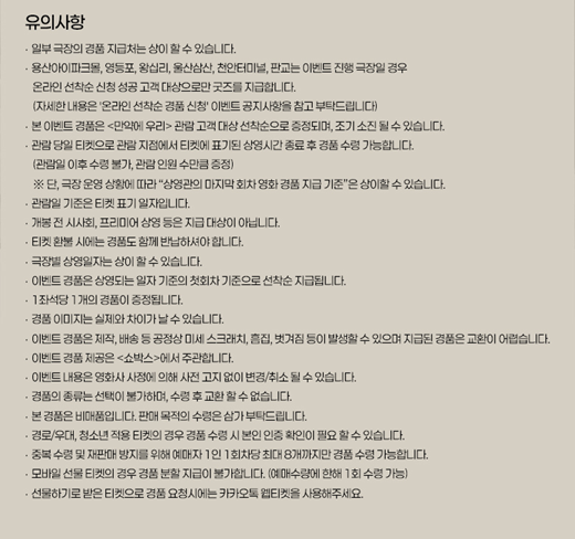CGV 상영관 중 영등포타임스퀘어, 왕십리, 용산아이파크몰, 천안터미널 지점은 '온라인 선착순 경품 신청 성공 고객'에게만 특전을 지급합니다. 미리 신청하셔서 특전을 수령하시길 바랍니다. 그 외의 특전 진행 상영관 지점은 '따로 신청할 필요 없이' 관람 후에 특전을 수령하시면 됩니다.