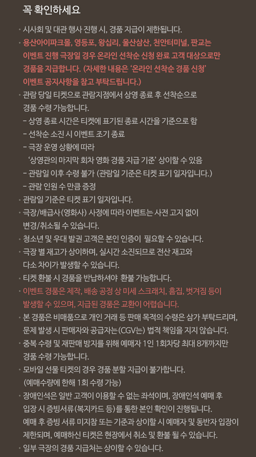 CGV 상영관 중 영등포, 왕십리, 용산아이파크몰, 울산삼산, 천안터미널, 판교 지점은 '온라인 선착순 경품 신청 완료 고객'에게만 특전을 지급합니다. 미리 신청하셔서 특전을 수령하시길 바랍니다. 그 외의 특전 진행 상영관 지점은 '따로 신청할 필요 없이' 관람 후에 특전을 수령하시면 됩니다.