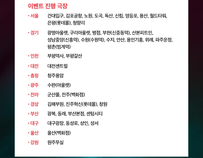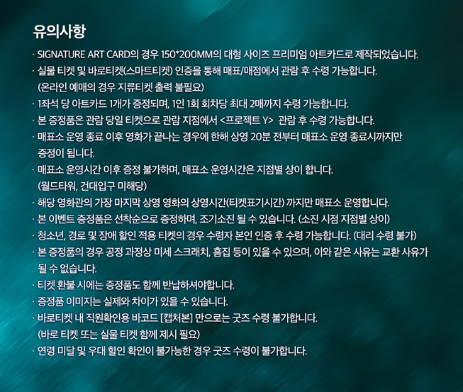 ※ 영화관(극장) 특전 및 이벤트는 이미지를 클릭하시면 잘린 곳 없이 전체적으로 자세하게 확인이 가능합니다. 명확하게 내용 파악 및 유의사항 파악을 위해 꼭 클릭하셔서 정보를 확인하시고 특전 수령과 이벤트 참여에 불찰 없으시길 바랍니다.
