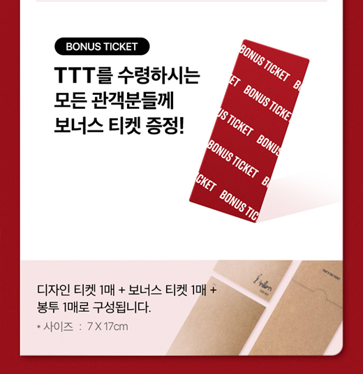 CGV 1주 차 특전은 'TTT(That's The Ticket)'입니다. 앞부분에 부분 에폭시 효과와 뒷부분에 부분 형압 효과 그리고 슬리브에 부분 유광 먹박 효과가 적용되어 있습니다.