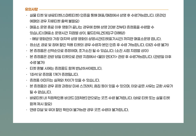 CGV 상영관 중 영등포타임스퀘어, 용산아이파크몰 지점은 '온라인 선착순 경품 신청 완료 고객'에게만 특전을 지급하니 미리 신청하셔서 특전을 수령하시길 바랍니다. 그 외의 이벤트 진행 상영관 지점은 '별도의 신청 없이' 관람 후에 특전을 수령하시면 됩니다.