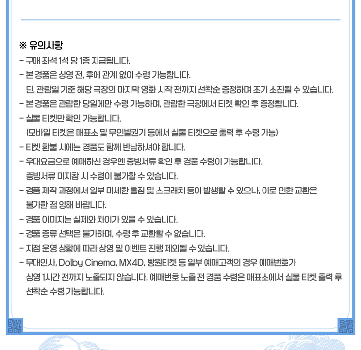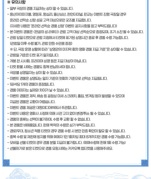 CGV 상영관 중 용산아이파크몰 지점은 '온라인 선착순 신청 완료 고객'만 특전을 수령하실 수 있으니 미리 신청하셔서 특전을 수령하시길 바랍니다. 그 외의 이벤트 상영관 지점은 '별다른 신청 없이' 관람 후에 특전을 수령하시면 됩니다.
