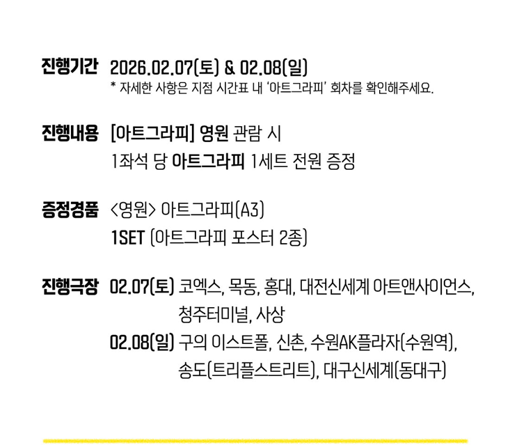 날짜별 진행하는 상영관 지점이 따로 있으니 이미지를 클릭하셔서 확인하시길 바랍니다.