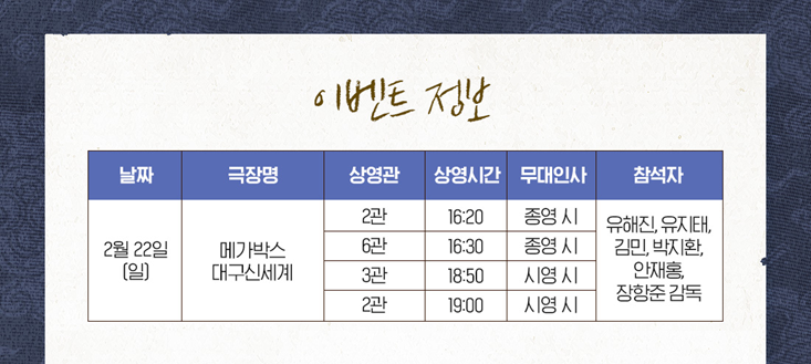 - 2026년 2월 22일 일요일. 메가박스 대구신세계에서 진행됩니다. 자세한 시간은 이미지를 클릭하셔서 확인하시길 바랍니다.