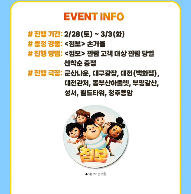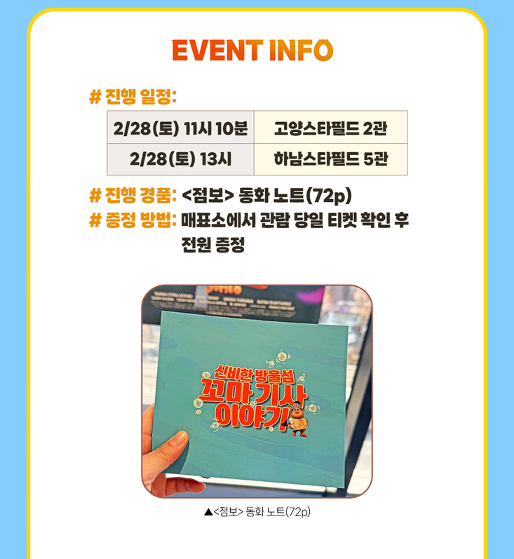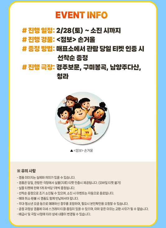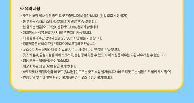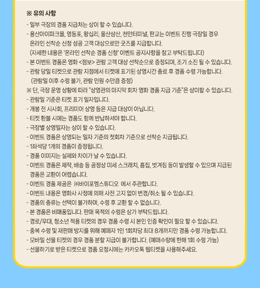CGV 상영관 중 왕십리, 울산삼산 지점은 '온라인 선착선 경품 신청 고객'에게만 특전을 지급합니다. 따라서 특전을 수령하시려면 미리 신청하셔야 합니다. 그 외의 이벤트 상영관 지점은 '별도의 신청 없이 관람 후'에 특전을 수령하시길 바랍니다.