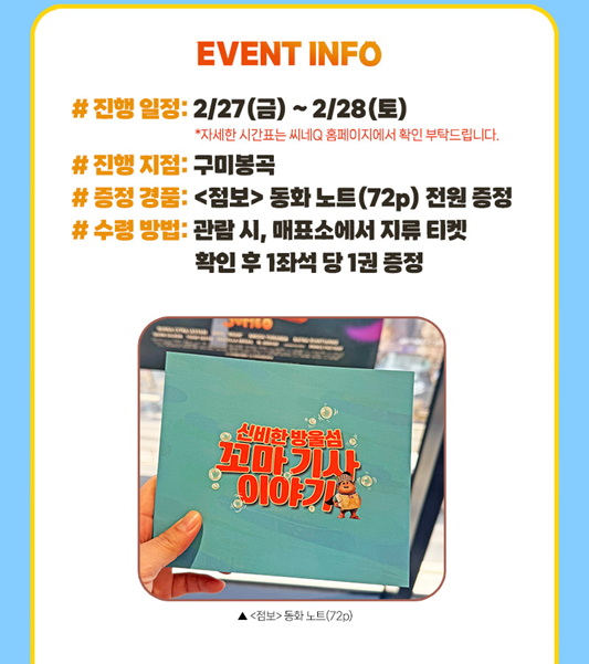 2026년 2월 27일 금요일부터 2026년 2월 28일 토요일까지 증정하며 소진되면 종료됩니다. 자세한 시간표는 씨네큐 홈페이지에서 확인하시길 바랍니다.