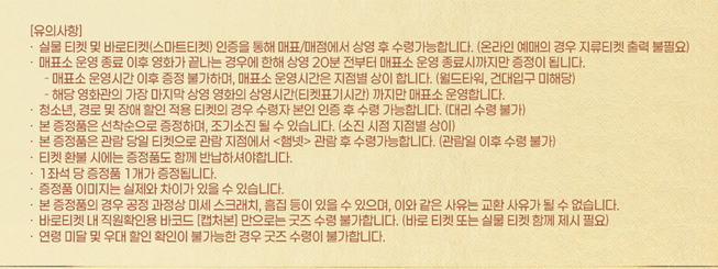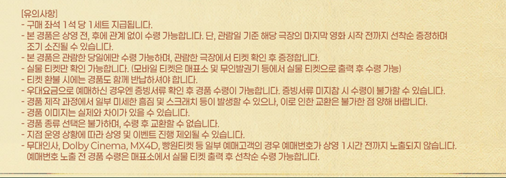 CGV 상영관 중 영등포타임스퀘어, 용산아이파크몰 지점은 '온라인 선착순 경품 신청 완료 고객'에게만 특전을 지급하니 미리 신청하셔서 특전을 수령하시길 바랍니다. 그 외의 이벤트 상영관 지점은 '별도의 신청 없이 관람 후'에 특전을 수령하시면 됩니다.