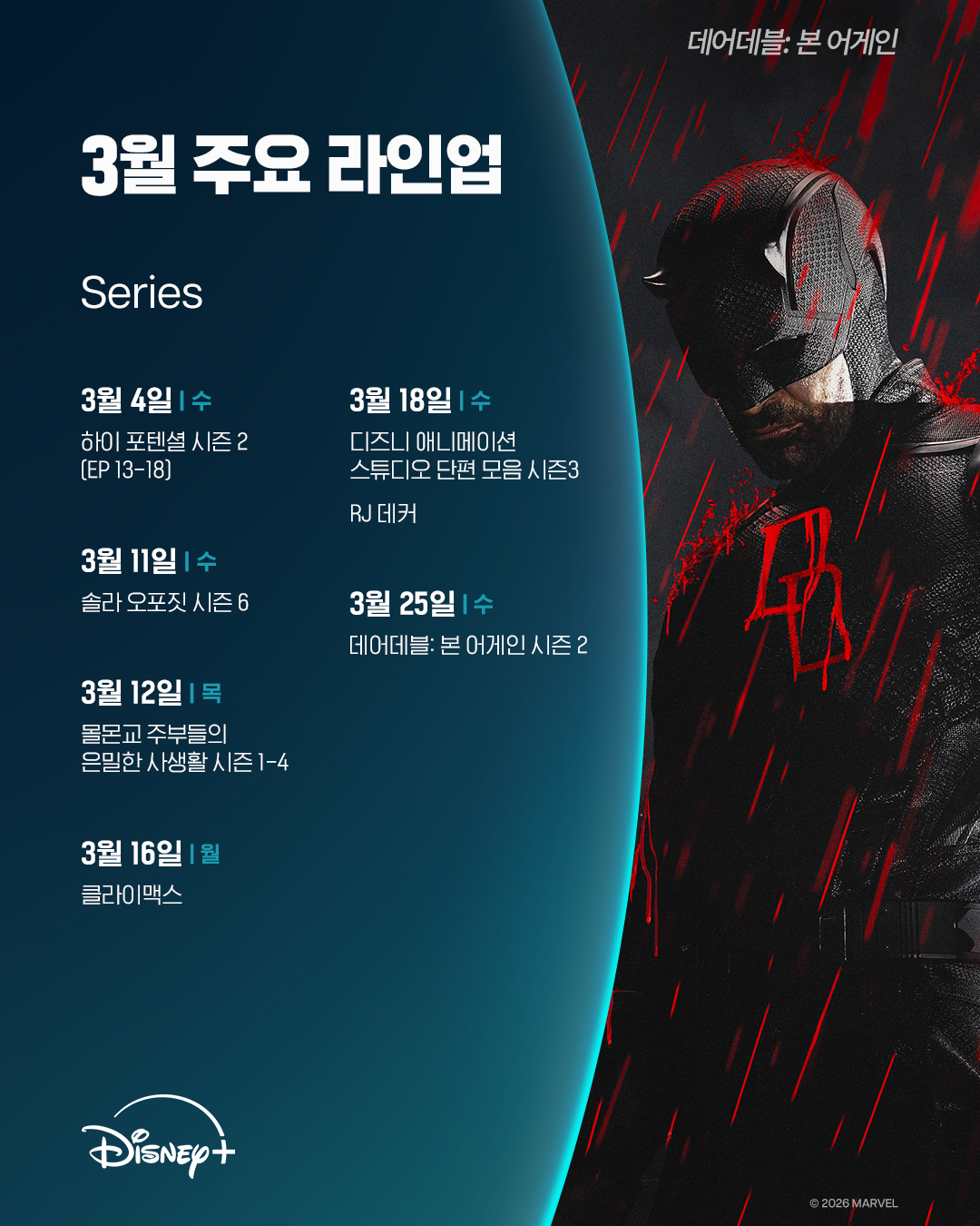 2026년 3월 "디즈니+(Disney+, 디즈니 플러스, 디플)"에 공개되는 작품들