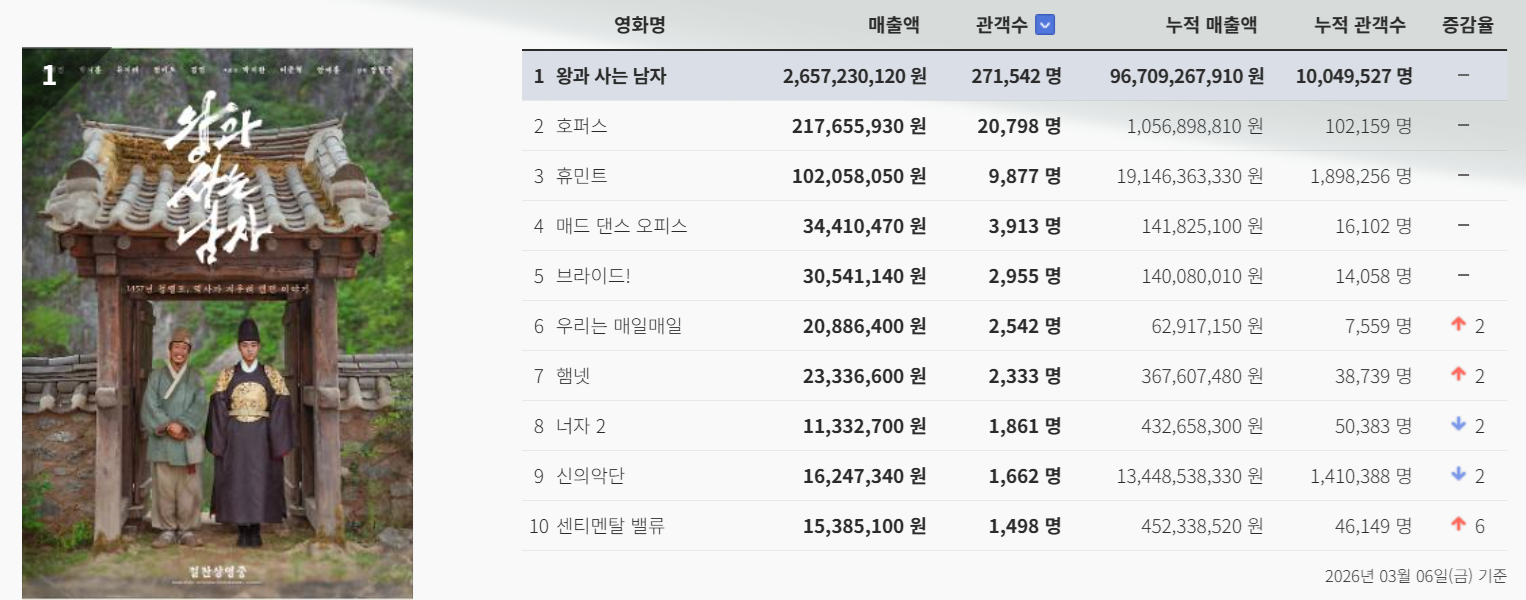 | [영화 <왕과 사는 남자> 6주 차 특전 목록 + 누적 관객수 1,100만 명 돌파!] (0) | 2026.03.10 |