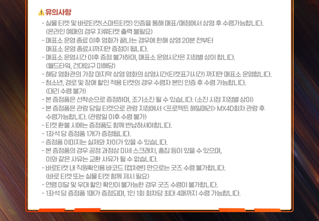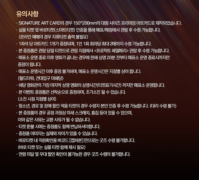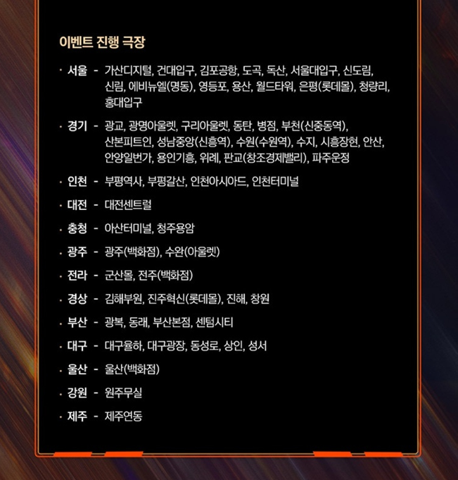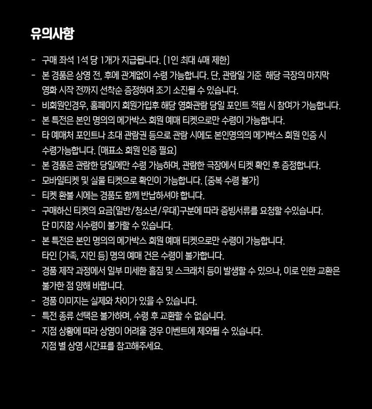 앞에서 언급했다시피, CGV 이벤트 상영관 중 대구, 영등포 타임스퀘어, 왕십리, 용산아이파크몰, 울산삼산, 천안터미널, 판교 지점은 미리 신청하셔야 하며, 나머지 CGV 이벤트 상영관 지점은 관람 후에 특전을 그냥 수령하시면 됩니다.