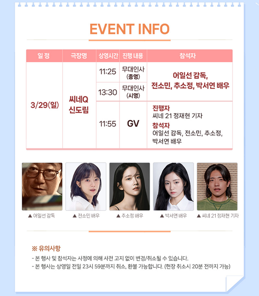 씨네큐(씨네Q, CINE Q) 무대인사 & GV에 '어일선 감독 그리고 전소민, 추소정, 박서연 배우, 씨네 21 정재현 기자'가 참석합니다.