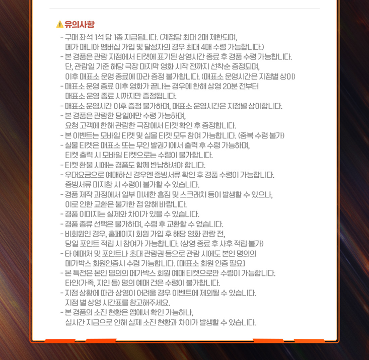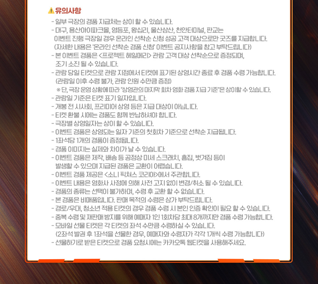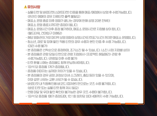 CGV 이벤트 상영관 중 용산아이파크몰, 울산삼산, 천안터미널 지점은 '온라인 선착순 경품 신청 완료 고객'에게만 특전을 지급하니 미리 신청하셔서 특전을 수령하시길 바랍니다. 그 외의 CGV 이벤트 상영관 지점은 '따로 신청할 필요 없이 관람 후' 특전을 수령하시면 됩니다.