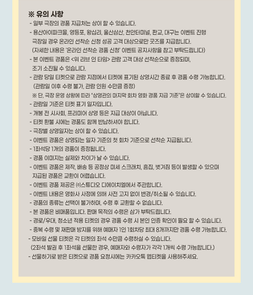 CGV 이벤트 상영관 중 대구, 영등포타임스퀘어, 왕십리, 용산아이파크몰, 울산삼산, 판교 지점은 '온라인 선착순 경품 신청 완료 고객'에게만 특전을 지급하니 미리 신청하셔서 특전을 수령하시길 바랍니다. 그 외의 CGV 이벤트 상영관 지점은 '따로 신청할 필요 없이 관람 후' 특전을 수령하시면 됩니다.