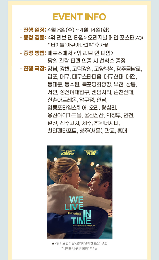 CGV 단독 개봉 영화 < 위 리브 인 타임> 1주 차 특전 목록