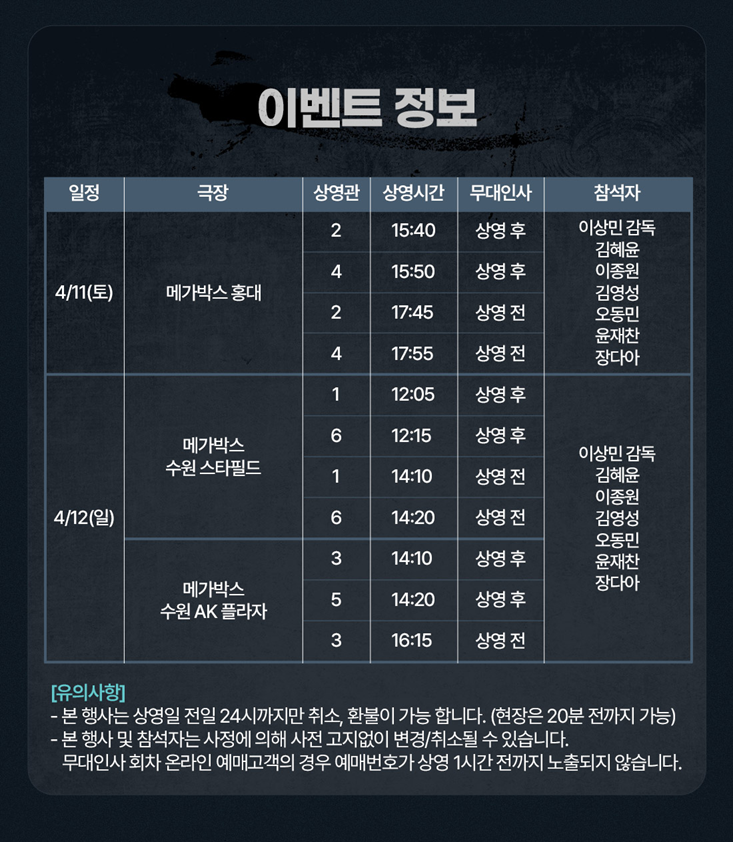 메가박스 개봉주 무대인사 - 11일(토) 홍대 / 12일(일) 수원 스타필드, 수원 AK 플라자