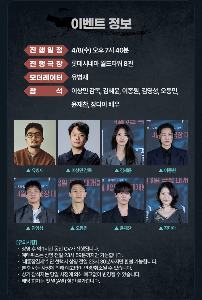 롯데시네마 개봉일 무대인사에 '이상민 감독 그리고 김혜윤, 이종원, 김영성, 오동민, 윤재찬, 장다아 배우'가 참석합니다.